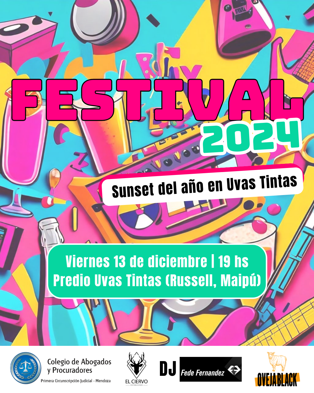 La cita para el tradicional sunset es el viernes 13 de diciembre, desde las 19, en el predio Uvas Tintas que se sitúa en Maipú. El Colegio de Abogados y Procuradores de la Primera Circunscripción Judicial despedirá el 2024 con un Festival que incluirá música, food trucks y barra libre de tragos para sus matriculados.