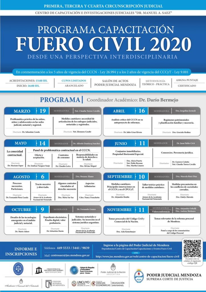 Todos los encuentros tendrán lugar entre las 16 y las 19.30 en el Salón de Actos del Colegio de Abogados y Procuradores de la Primera Circunscipción Judicial de Mendoza que se ubica en Pedro Molina 447 de la Ciudad de Mendoza.