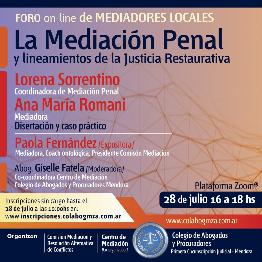 El encuentro se propone reflexionar sobre el tema y analizar un caso práctico. Estará a cargo de Lorena Sorrentino, coordinadora del Área de Mediación Penal del Cuerpo de Mediadores de la Provincia de Mendoza; Ana María Romani, integrante del Cuerpo de Mediadores y de la Comisión de Mediación del Colegio y Paola Carolina Fernández, presidente de la Comisión de Mediación, mediadora y coach ontológica. Moderará el encuentro Giselle Fatella, co-coordinadora del Centro de Mediación del Colegio de Abogados de la Primera Circunscripción Judicial de Mendoza.