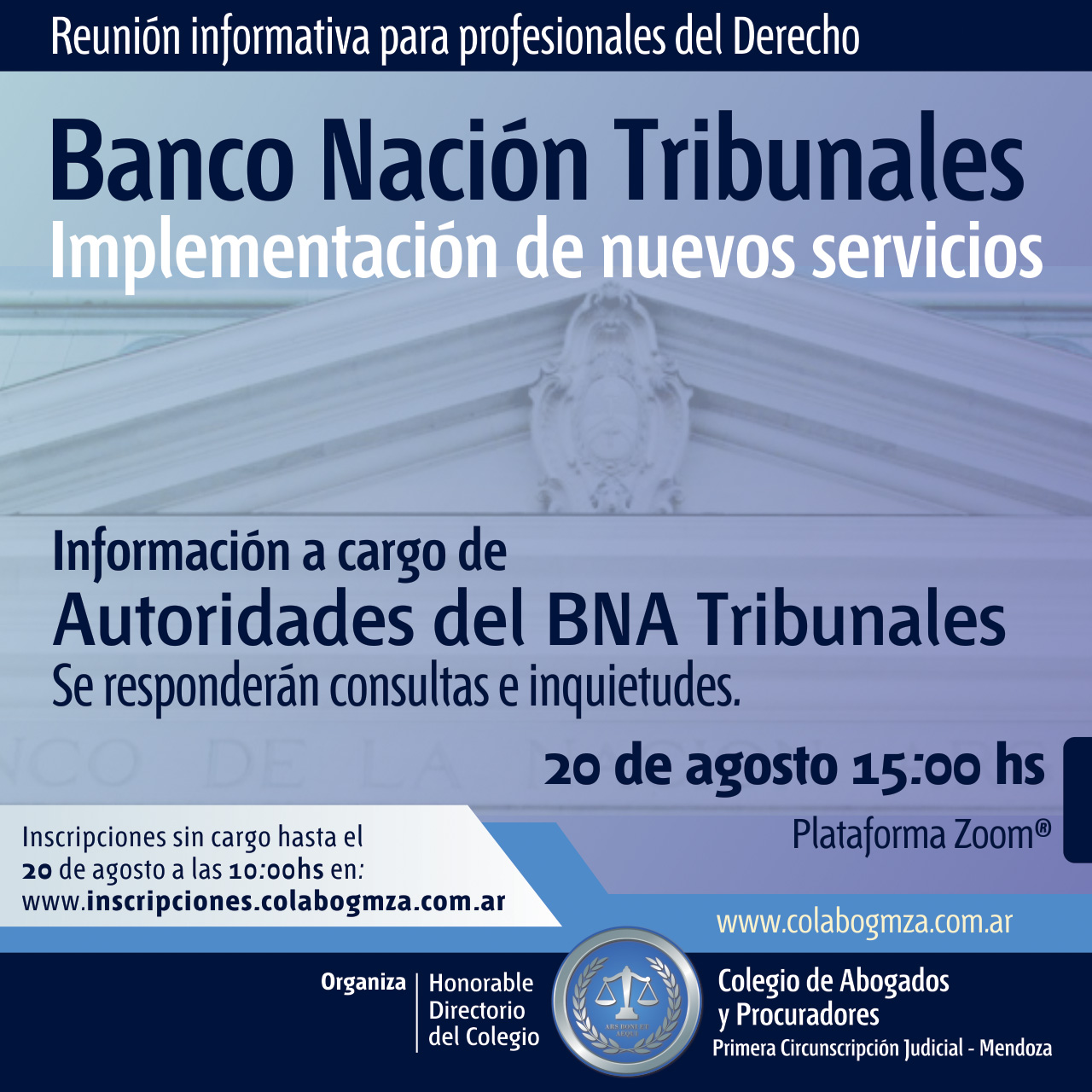 Será en una reunión que solicitó el Banco y que el Colegio de Abogados facilitó para que profesionales del Derecho puedan hacer llegar sus inquietudes y conocer cómo se están implementando nuevos servicios en la sucursal de Tribunales. La cita es el jueves 20 de agosto a las 15 en el Zoom del Colegio. Para participar es necesario inscribirse en: inscripciones.colabogmza.com.ar