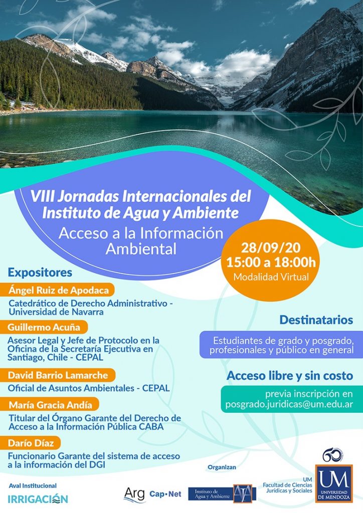Las VIII Jornadas Internacionales del Instituto de Agua y Ambiente “Acceso a la Información Ambiental” de la Universidad de Mendoza tendrán acceso virtual libre y sin costo. Será necesario realizar una inscripción previa en posgrado.juridicas@um.edu.ar