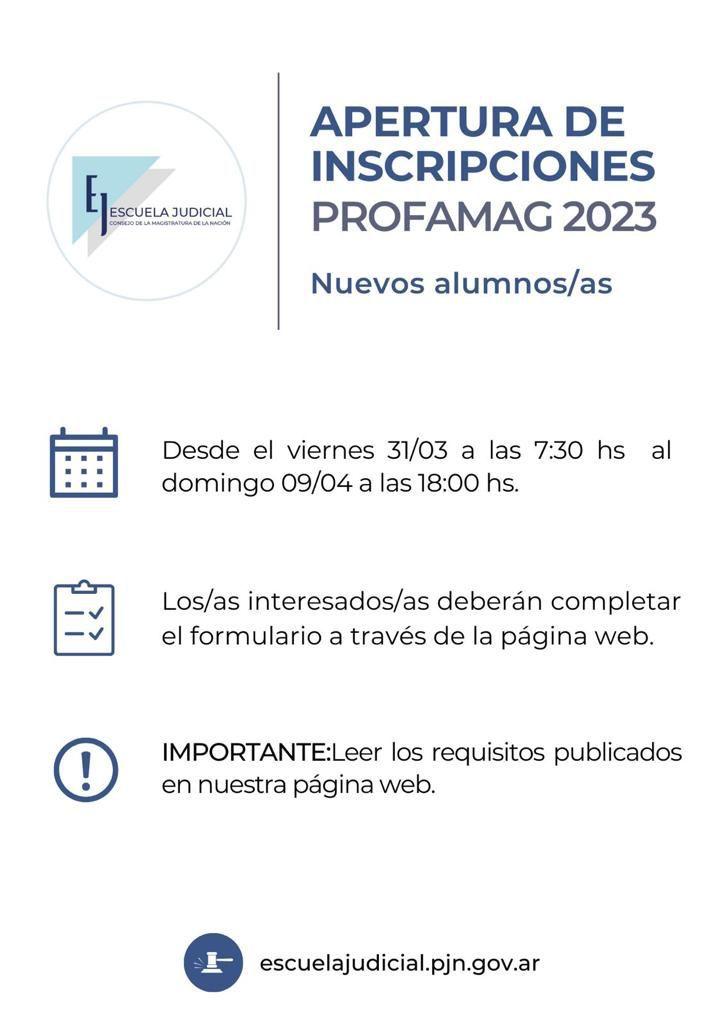 Los interesados en inscribirse en el PROFAMAG pueden hacerlo del viernes 31 de marzo al domingo 9 de abril, a través del siguiente link: https://inscripcionesej.pjn.gov.ar/inscripcion/formulario/otrosabogados