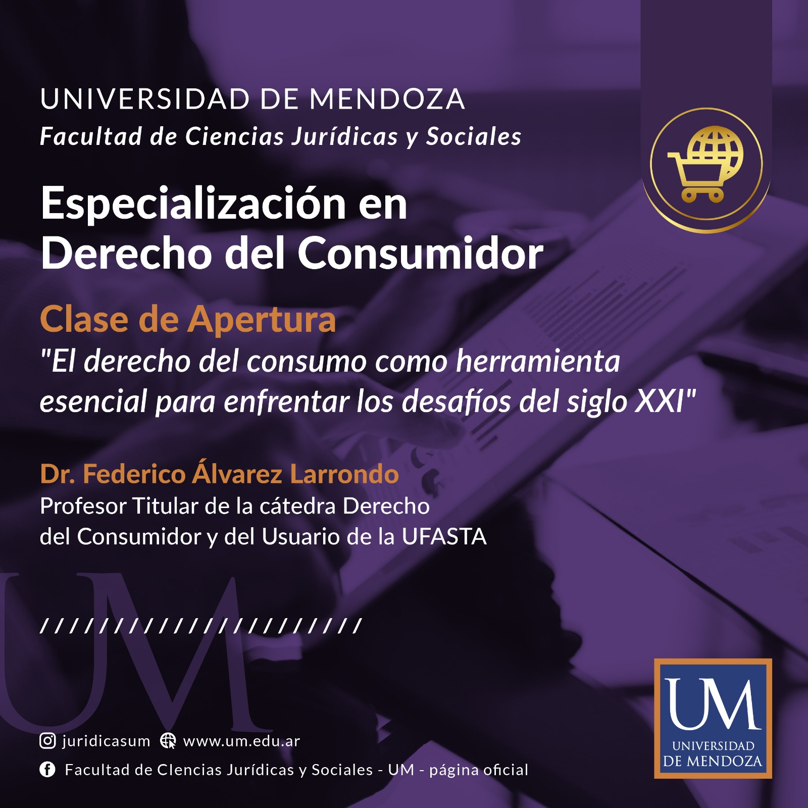 La Universidad de Mendoza presenta la Especialización en Derecho del Consumidor, una nueva capacitación de posgrado que busca formar profesionales de alto nivel en el área específica del derecho de los consumidores y usuarios, defensa de la competencia y lealtad comercial. Inicia en mayo y los interesados en cursarla pueden inscribirse en el siguiente enlace: https://forms.gle/32fqJBdU6qouTFux6