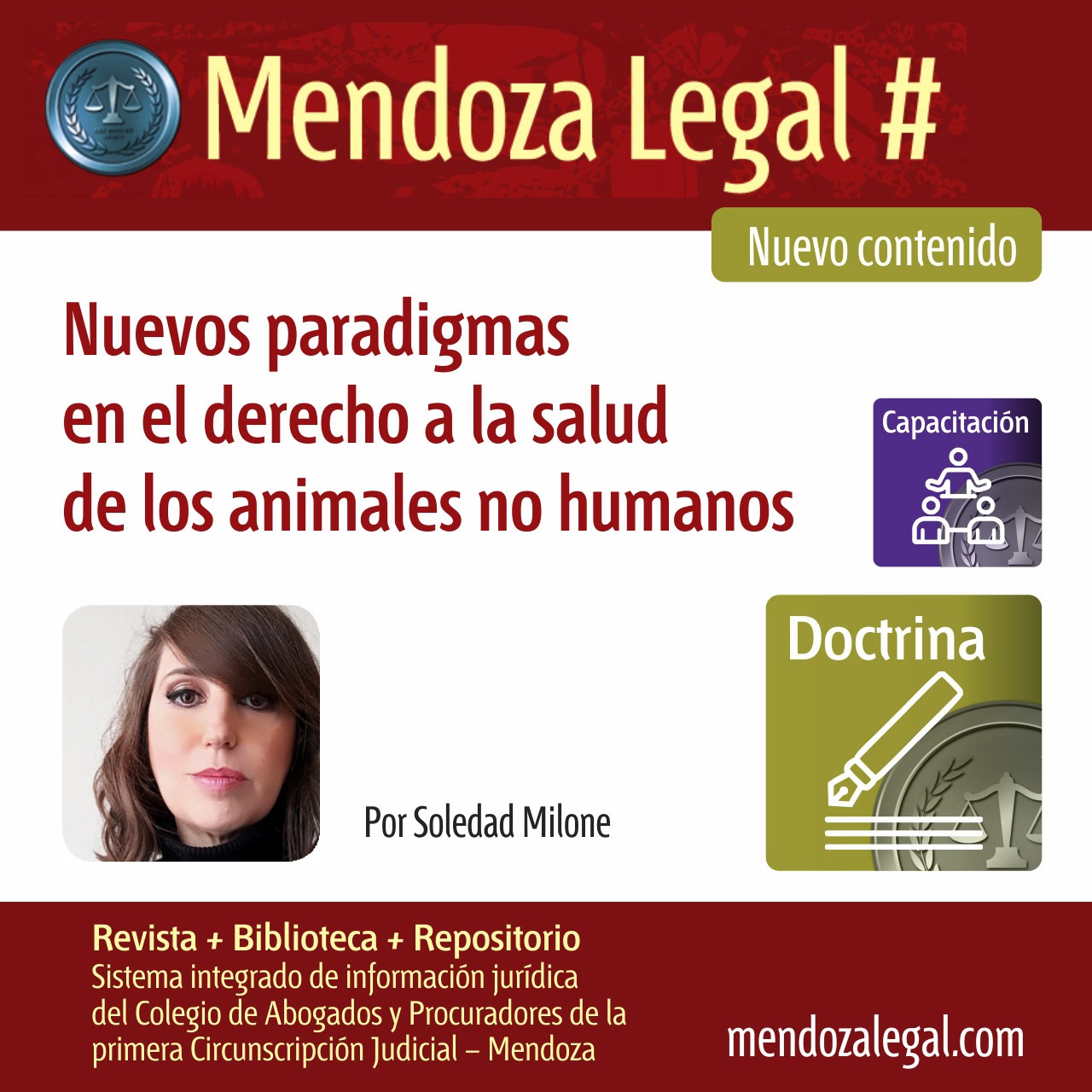 Mendoza Legal es el sistema integrado de información jurídica del Colegio de Abogados y Procuradores de la Primera Circunscripción Judicial de Mendoza. Una de sus últimas publicaciones ofrece un artículo sobre los nuevos paradigmas en materia de salud animal surgidos a partir de su reconocimiento como sujetos de derecho, desarrollando el alcance de estos y sus implicaciones en la medicina veterinaria, así como su impacto en el derecho y la jurisprudencia nacional e internacional.