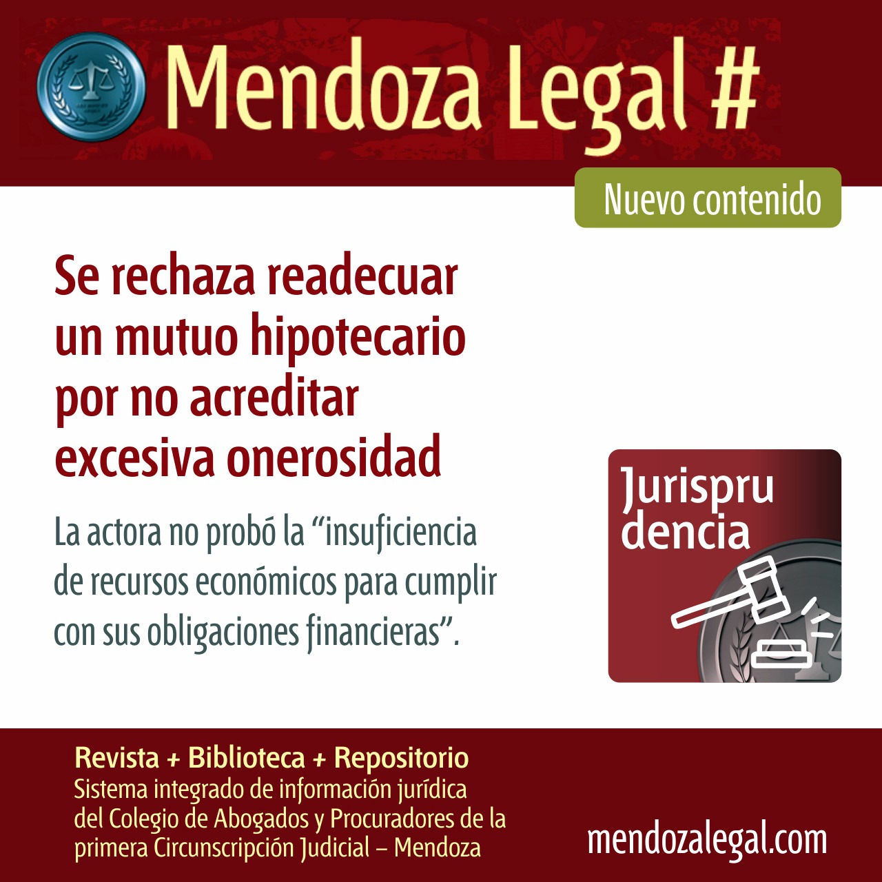 Es una resolución del Juzgado Federal N° 2 de Mendoza donde se rechaza readecuar un mutuo hipotecario por no acreditar excesiva onerosidad. El texto está disponible en www.mendozalegal.com o aquí debajo.