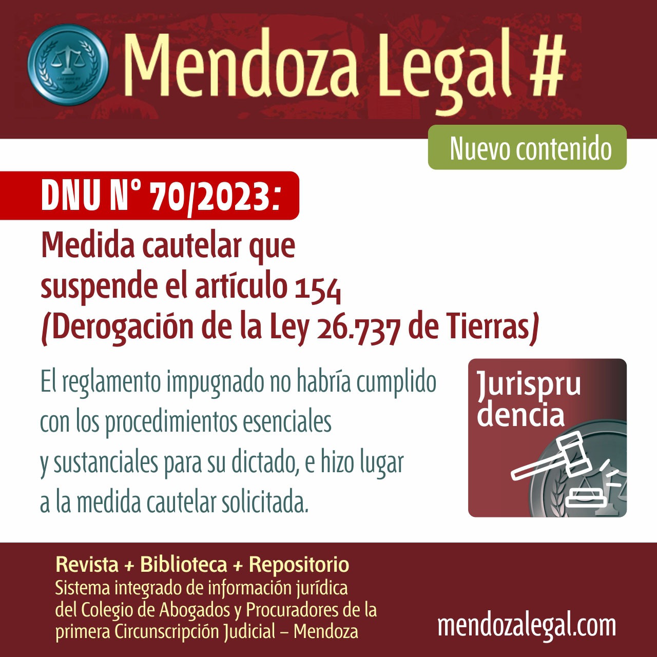 Mendoza Legal es el sistema integrado de información jurídica del Colegio de Abogados y Procuradores de la Primera Circunscripción Judicial de Mendoza. Una de sus últimas publicaciones ofrece un fallo de la Cámara Nacional de Apelaciones del Trabajo – Sala Feria, con una medida cautelar que suspende el artículo 154 sobre la derogación de la Ley 26.737 de Tierras.