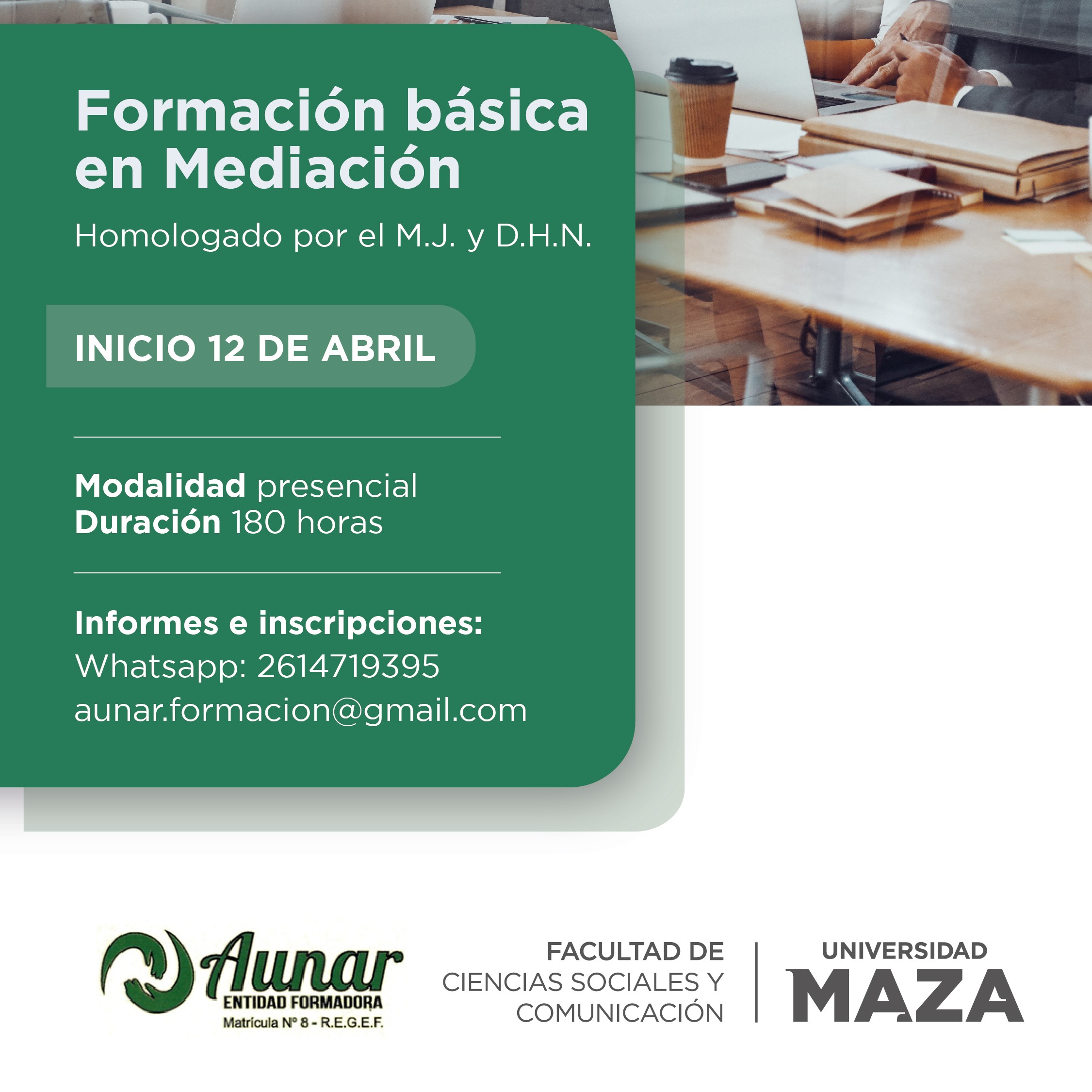 Profesionales del Derecho y la Procuración podrán inscribirse en un curso de «Formación básica de Mediadores», que ofrece la entidad formadora Aunar y la Universidad Maza. La capacitación está homologada por el Ministerio de Justicia y Derechos Humanos de la Nación y habilita para el ejercicio de la profesión de mediador en todo el país.