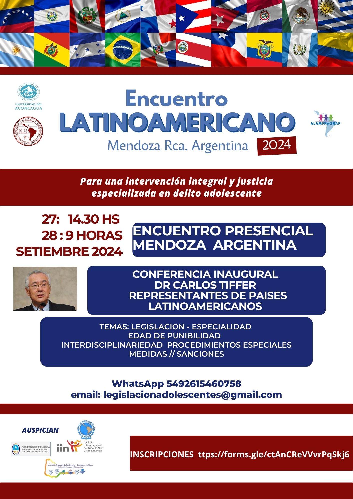 El «Encuentro Latinoamericano para una intervención integral y justicia especializada en delito adolescente» se realizará el 27 de septiembre, desde las 14.30, y el 28, desde las 9, en el auditorio de la Universidad del Aconcagua ubicado en Catamarca 147 de la ciudad de Mendoza.
