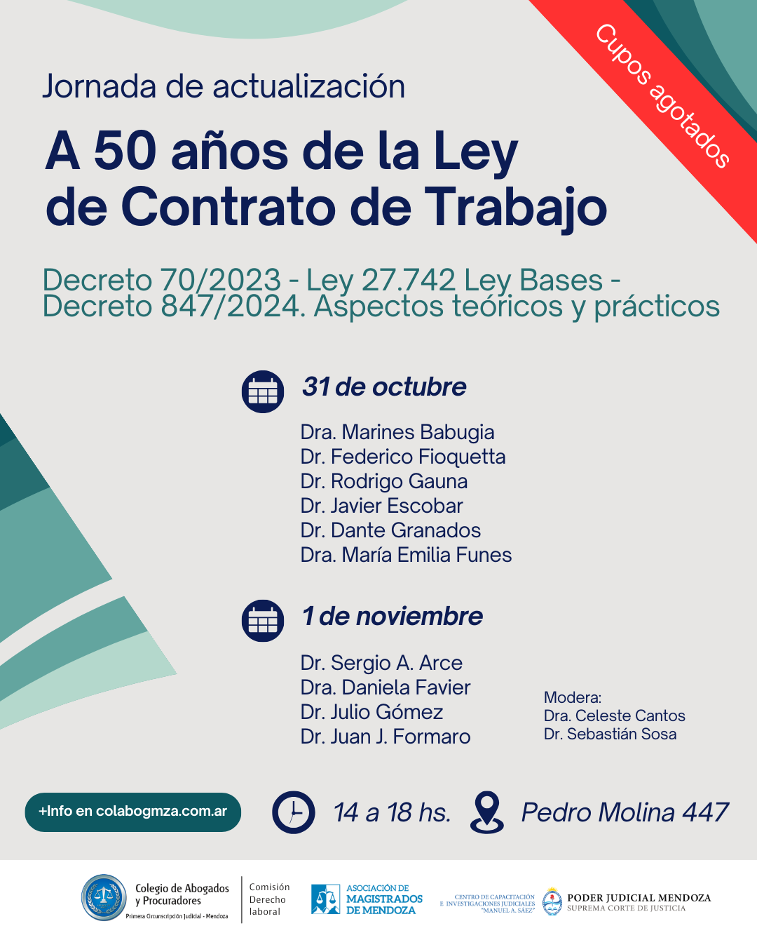 La jornada, titulada “A 50 años de la Ley de Contrato de Trabajo. Decreto 70/2023 – Ley 27.742 Ley Bases – Decreto 847/2024. Aspectos teóricos y prácticos”, reunirá a magistrados y especialistas en Derecho Laboral en la sede del Colegio de Abogados y Procuradores de Mendoza, ubicada en Pedro Molina 447 de Ciudad. Está dirigida a abogados, funcionarios, estudiantes y público en general.