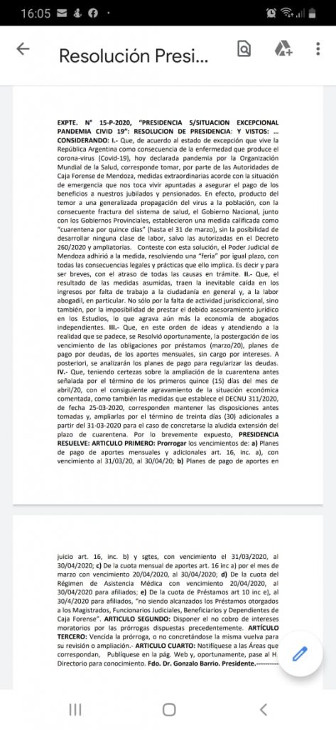 En efecto, producto del temor a una generalizada propagación del virus a la población, con la consecuente fractura del sistema de salud, el Gobierno Nacional, junto con los Gobiernos Provinciales, establecieron una medida calificada como “cuarentena por quince días” (hasta el 31 de marzo), sin la posibilidad de desarrollar ninguna clase de labor, salvo las autorizadas en el Decreto 260/2020 y ampliatorias. Conteste con esta solución, el Poder Judicial de Mendoza adhirió a la medida, resolviendo una “feria” por igual plazo, con todas las consecuencias legales y prácticas que ello implica. Es decir y para ser breves, con el atraso de todas las causas en trámite. II.- Que, el resultado de las medidas asumidas, traen la inevitable caída en los ingresos por falta de trabajo a la ciudadanía en general y, a la labor abogadil, en particular. No sólo por la falta de actividad jurisdiccional, sino también, por la imposibilidad de prestar el debido asesoramiento jurídico en los Estudios, lo que agrava aún más la economía de abogados independientes. III.- Que, en este orden de ideas y atendiendo a la realidad que se padece, se Resolvió oportunamente, la postergación de los vencimiento de las obligaciones por préstamos (marzo/20), planes de pago por deudas, de los aportes mensuales, sin cargo por intereses. A posteriori, se analizarán los planes de pago para regularizar las deudas. IV.- Que, teniendo certezas sobre la ampliación de la cuarentenaantes señalada por el término de los primeros quince (15) días del mes de abril/20, con el consiguiente agravamiento de la situación económicacomentada, como también las medidas que establece el DECNU311/2020, de fecha 25-03-2020, corresponden mantener las disposiciones antes tomadas y, ampliarlas por el término de treinta días (30) adicionalesa partir del 31-03-2020para el caso de concretarse la aludida extensión del plazo de cuarentena.Por lo brevemente expuesto, PRESIDENCIA RESUELVE: