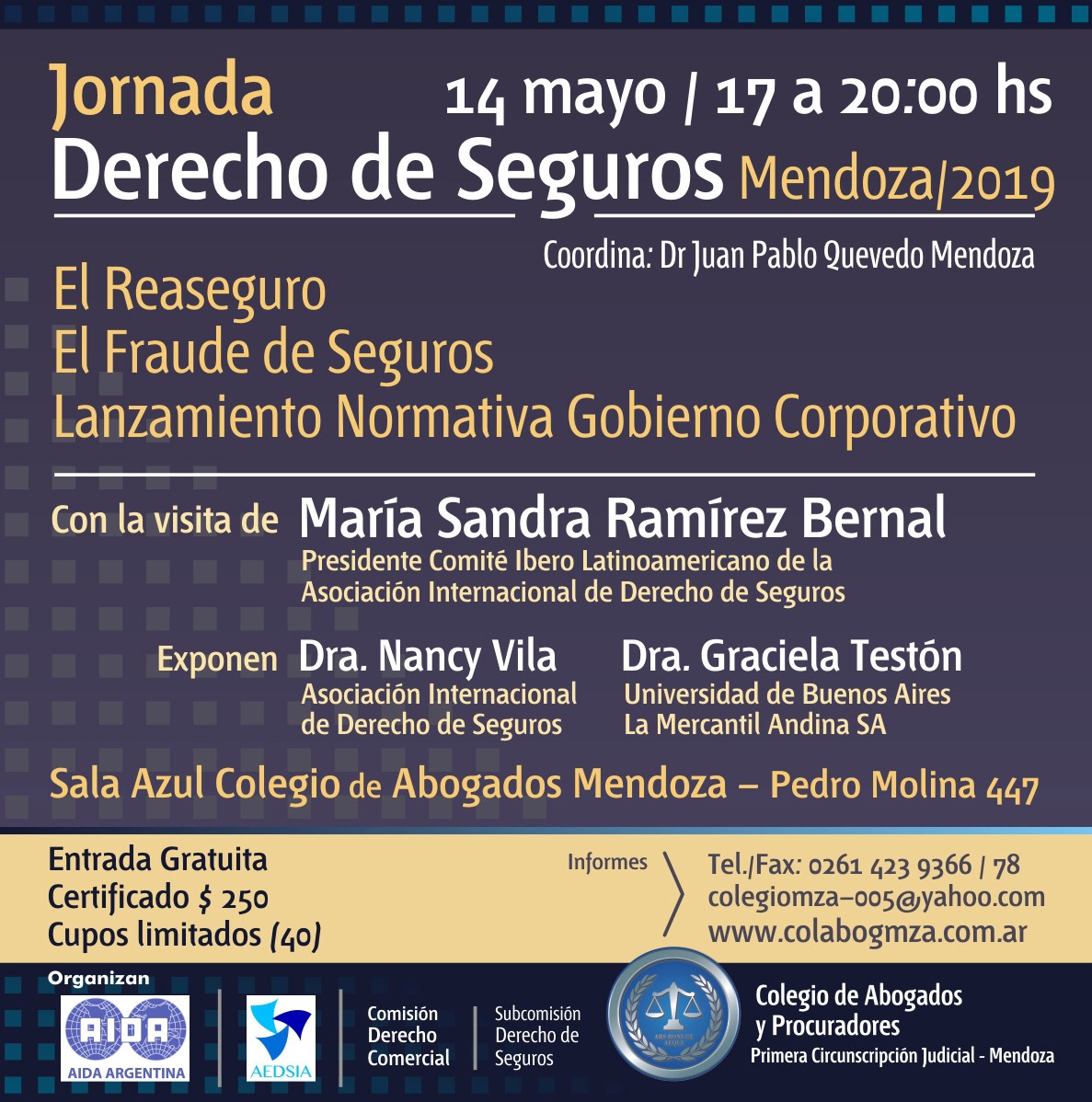 Será el martes 14 de mayo desde las 17 en la sede del Colegio de Abogados y Procuradores de Mendoza. En la ocasión expondrá, entre otros disertantes, la presidenta Comité Ibero latinoamericano de la Asociación Internacional de Derecho de Seguros; María Sandra Ramírez Bernal.