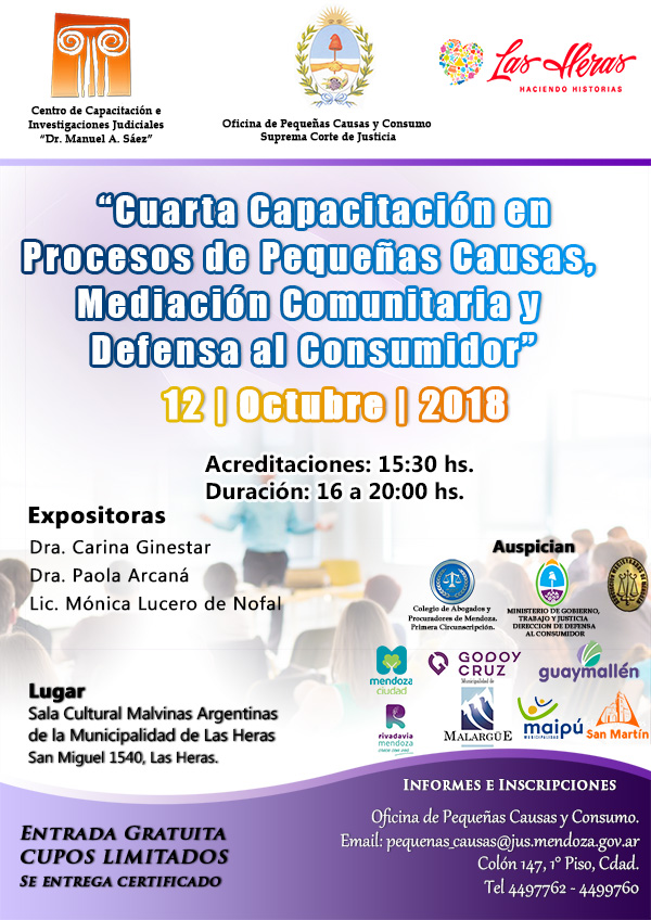 El Directorio informa que el día 12 de octubre se realizará la «Cuarta capacitación en Procesos de Pequeñas Causas, Mediación Comunitaria y Defensa al Consumidor». Lugar: Colón 147 1er piso Ciudad Mendoza.