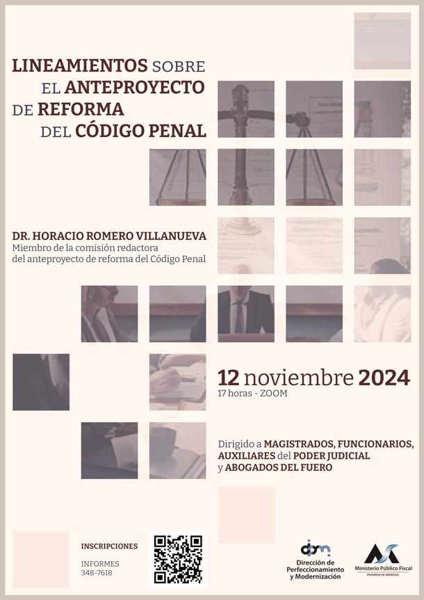 Magistrados, funcionarios, auxiliares del Poder Judicial y abogados del fuero podrán participar del curso «Lineamientos sobre el anteproyecto de reforma del Código Penal». Se realizará el martes 12 de noviembre, a las 17, por Zoom. Estará a cargo del Dr. Horacio Romero Villanueva, miembro de la comisión redactora del anteproyecto.
