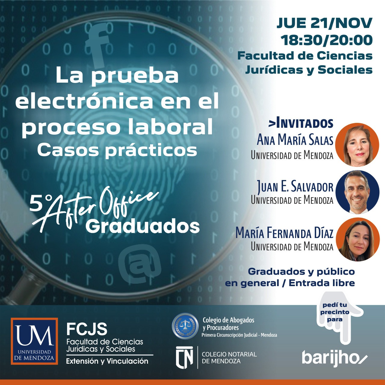 Participarán Ana María Salas, María Fernanda Diaz y Juan E. Salvador, quienes disertarán sobre casos prácticos referidos a La prueba electrónica en el proceso laboral. Luego de las 20, la reunión continuará en el local de Barijho de calle Arístides para un encuentro informal y de camaradería entre colegas.