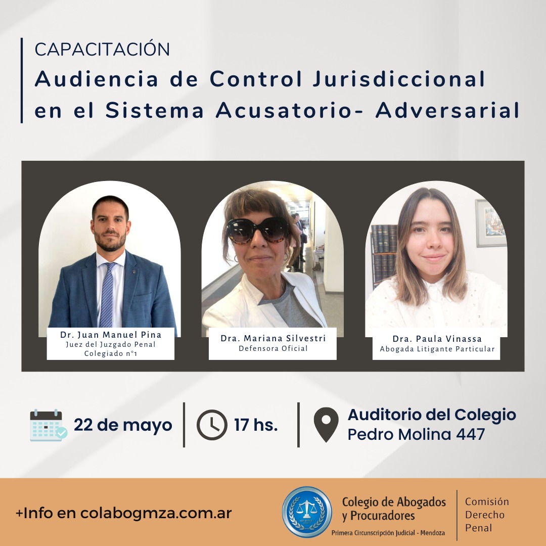 Profesionales del Derecho podrán capacitarse de manera gratuita en el sistema acusatorio- adversarial en la provincia de Mendoza. La jornada «Audiencia de Control Jurisdiccional en el Sistema Acusatorio- Adversarial» se ofrecerá en el Auditorio del Colegio de Abogados y Procuradores de la Primera Circunscripción Judicial de Mendoza, ubicado en Pedro Molina 447 de Ciudad, el lunes 22 de mayo, desde las 17. Los interesados en participar deberán inscribirse en el siguiente formulario online: inscripciones.colabogmza.com.ar
