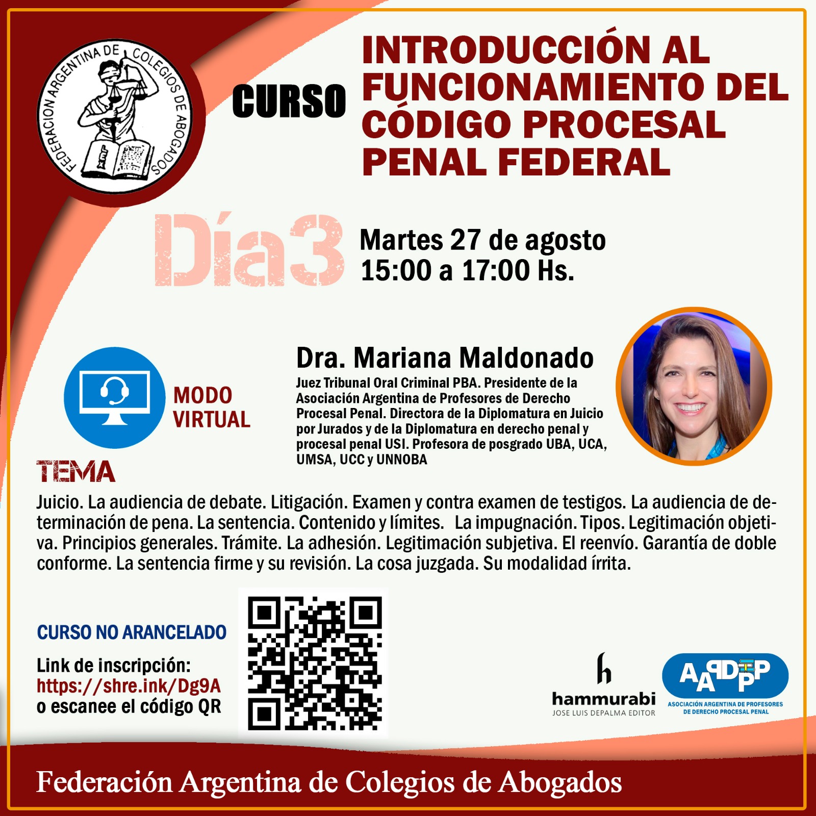 En el tercero disertará la Dra. Mariana Maldonado y será virtual el martes 27 de agosto, de 15 a 17. Abordará el juicio, la audiencia de debate, litigación, examen y contra examen de testigos, la audiencia de determinación de pena, la sentencia, contenido y límites, la impugnación, tipos, legitimación objetiva, principios generales, trámite, la adhesión, legitimación subjetiva, el reenvío, garantía de doble conforme, la sentencia firme y su revisión, la cosa juzgada y su modalidad írrita.