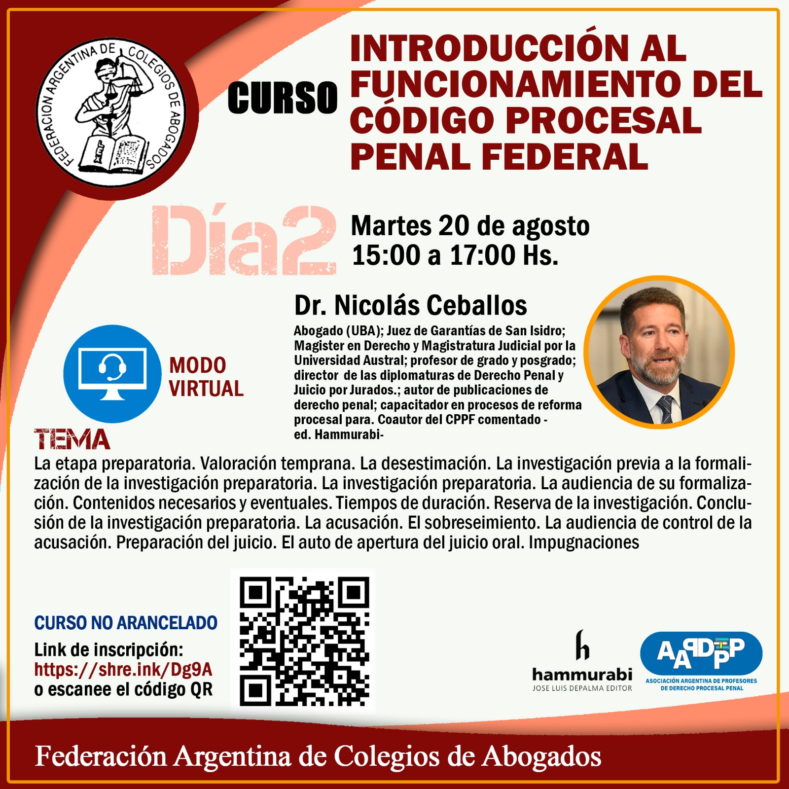 El segundo, a cargo del Dr. Nicolás Ceballos, se dictará el martes 20 de agosto, de 15 a 17, de forma virtual. Se centrará en la etapa preparatoria, valoración temprana, desestimación, investigación previa, investigación preparatoria, audiencia de formalización, contenidos, tiempos, reserva, conclusión, acusación, sobreseimiento, audiencia de control de la acusación, preparación del juicio, auto de apertura del juicio oral e impugnaciones.