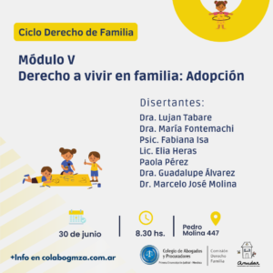 Será el jueves 30 de junio a las 8.30, en la sede del Colegio de Abogados de Mendoza. Inscripciones abiertas on line en: inscripciones.colabogmza.com.ar Adopción,