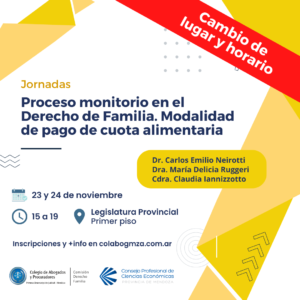 Abordarán el proceso monitorio y la modalidad de pago de cuota alimentaria. Serán el 23 y 24 de noviembre, de 15 a 19, en la
