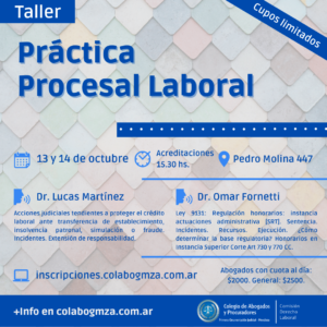 Se realizará el 13 y 14 de octubre, a las 15.30, en el Colegio de Abogados de Mendoza. Estará a cargo de los expertos Lucas