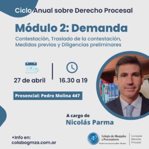 Nicolás Parma y Martín Torres expondrán sobre demanda; contestación, traslado de la contestación, medidas previas y diligencias preliminares el miércoles 27 de abril a las