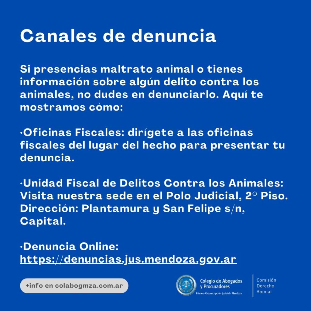 Para denunciar estos delitos, se establecen varios canales disponibles para la ciudadanía. Entre ellos se encuentran las Oficinas Fiscales del lugar del hecho, la Unidad Fiscal de Delitos contra los Animales ubicada en el Polo Judicial segundo piso (Plantamura y San Felipe s/n, Capital), así como también la opción online a través de https://denuncias.jus.mendoza.gov.ar.