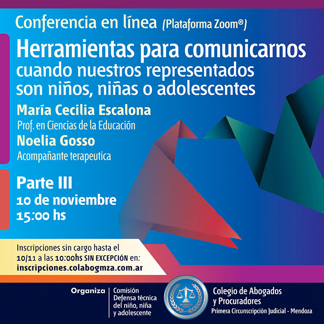 Una conferencia on line a través del Zoom del Colegio de Abogados y Procuradores de la Primera Circunscripción Judicial de Mendoza se ocupará de ofrecer herramientas de comunicación en el caso de representar a niñas, niños y adolescentes. La tercera parte de la capacitación, que será gratuita, está prevista para el miércoles 10 de noviembre a las 15. Los interesados pueden inscribirse hasta el mismo día a las 10 a través del formulario que se consigna a continuación: inscripciones.colabogmza.com.ar