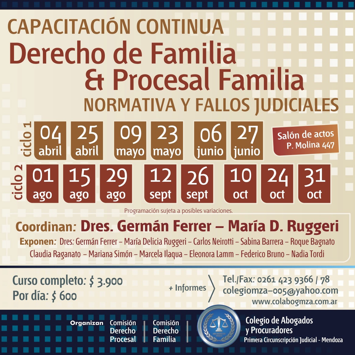 El ciclo comenzó en abril y se extenderá hasta el 31 de octubre de este año. Buscan proporcionar una formación integral en Derecho de Familia y Procesal Familia con la inclusión de análisis de la legislación vigente y jurisprudencia local y nacional sobre los diferentes temas incluidos.