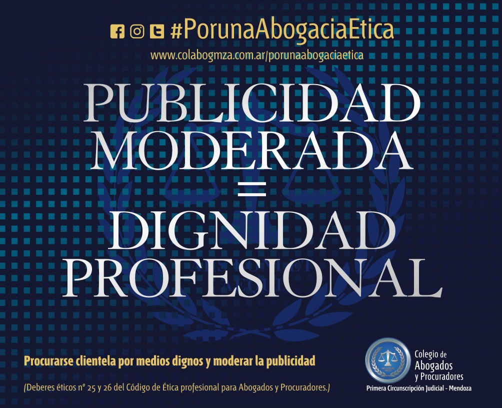 Artículo 26. De moderación de la publicidad. 1) El abogado debe reducir su publicidad y papelería a indicar la dirección del estudio, títulos universitarios o académicos y horario de atención al público. Tal publicidad debe ser moderada y sería menoscabando la dignidad profesional toda otra orientada directa o indirectamente por el abogado con fines de lucro, captación de clientes o auto elogio.