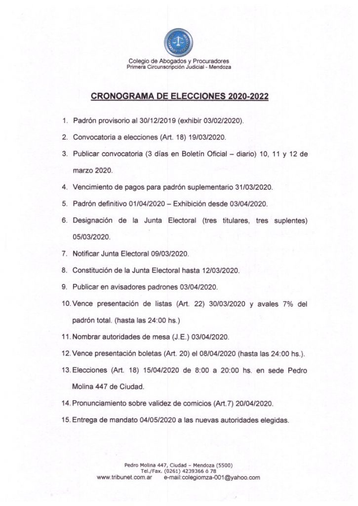 El Colegio de Abogados y Procuradores de Mendoza anuncia el Cronograma de elecciones de nuevas autoridades para el período 2020-2022.
