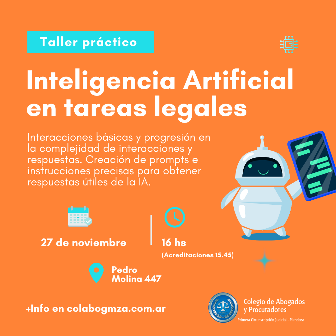 El miércoles 27 de noviembre se ofrecerá la continuación del taller práctico sobre el uso de la Inteligencia Artificial en tareas legales. Se realizará ese día, a las 16, en la sede del Colegio de Abogados ubicada en Pedro Molina 447 de Ciudad. Las acreditaciones serán a 15.45 hs.