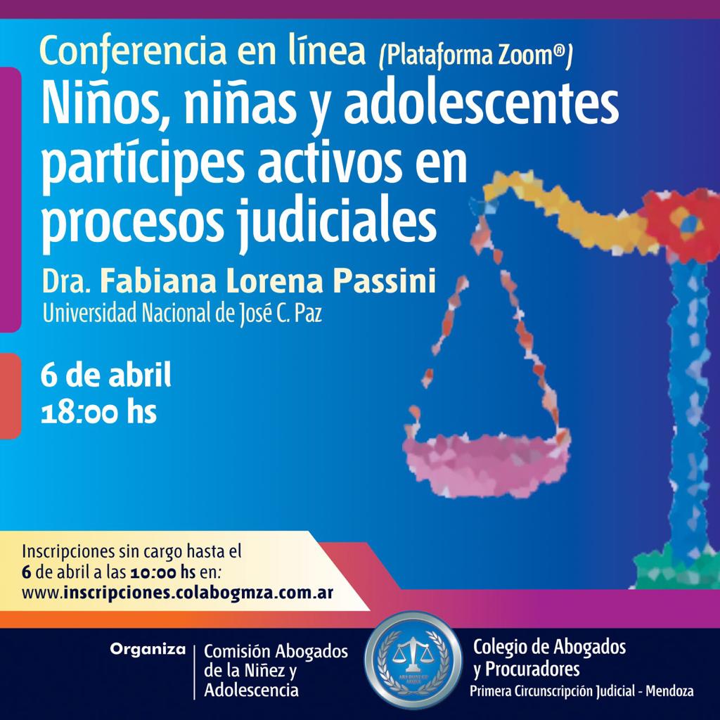 “Niños, niñas y adolescentes partícipes activos en procesos judiciales” será el tema de análisis de una conferencia on line que se llevará adelante a través del Zoom del Colegio de Abogados y Procuradores de la Primera Circunscripción Judicial el martes 6 de abril a las 18.