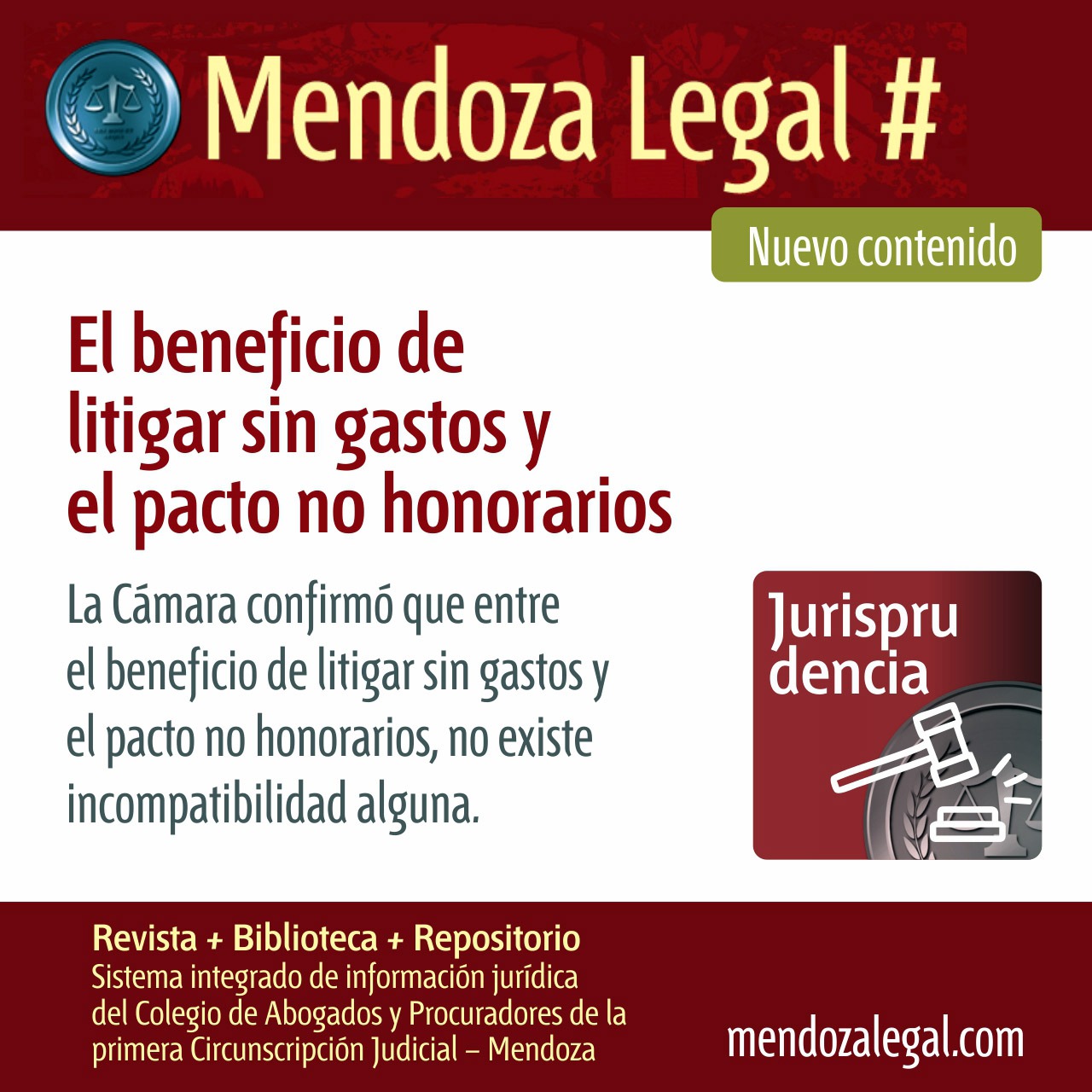 Mendoza Legal es el sistema integrado de información jurídica del Colegio de Abogados y Procuradores de la Primera Circunscripción Judicial de Mendoza. Una de sus últimas publicaciones ofrece un fallo sobre el beneficio de litigar sin gastos y el pacto no honorarios.