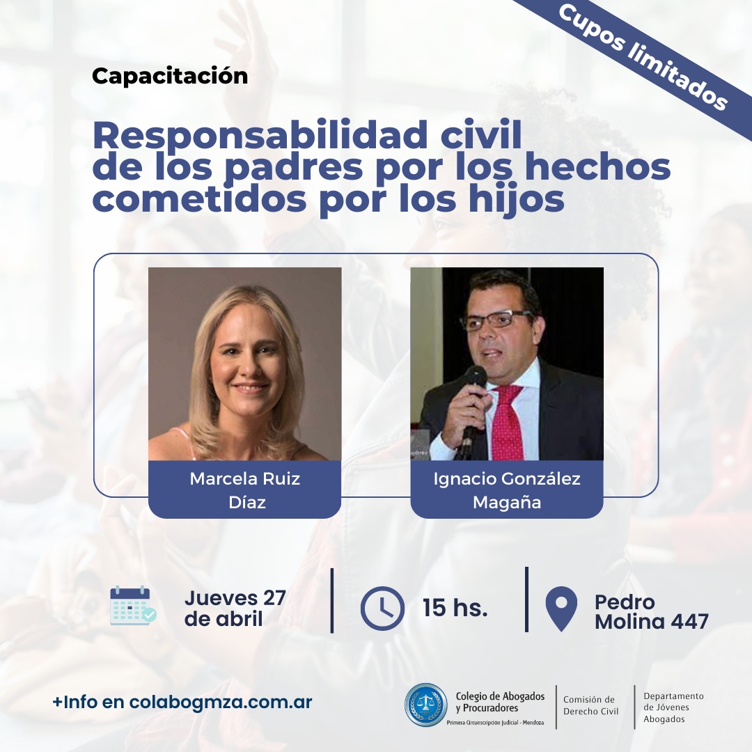 «Responsabilidad Civil de los padres por los hechos cometidos por los hijos. Código Civil y Comercial de la Nación. Casos prácticos» es el nombre de una jornada de capacitación que ofrece el Colegio de Abogados y Procuradores de Mendoza. Se realizará el jueves 27 de abril, de 15 a 19:30, en el salón de actos del Colegio de Abogados y Procuradores de Mendoza, ubicado en Pedro Molina 447 de Ciudad. El cupo será de 150 personas.