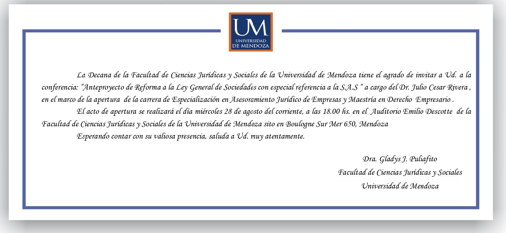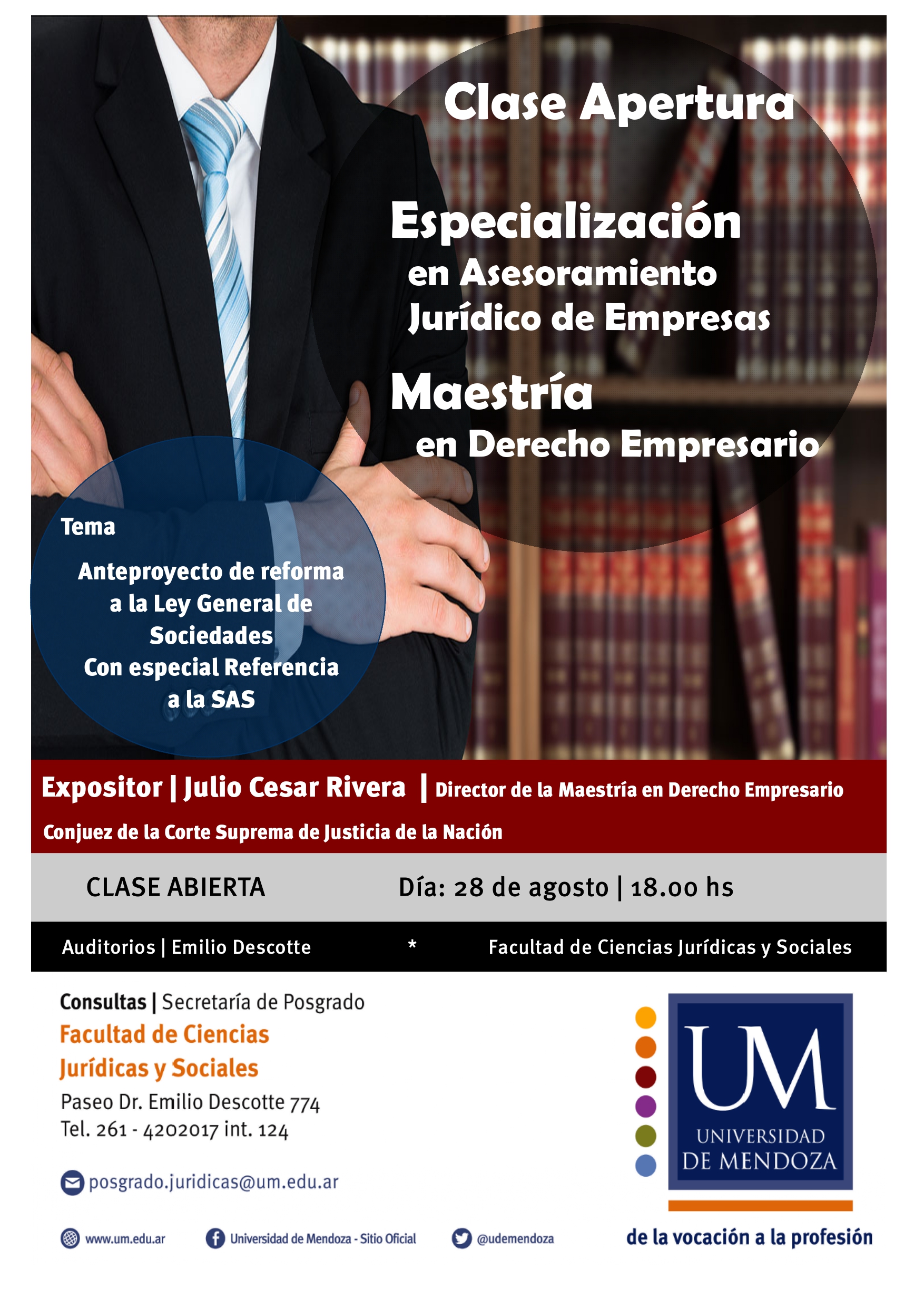 La Universidad de Mendoza ofrece a los matriculados del Colegio de Abogados la inscripción a la Especialización de Posgrado en Asesoramiento Jurídico de Empresa. Está acreditada por la Comisión Nacional de Evaluación y Acreditación Universitaria, (CONEAU) a través de su Resolución nº 438/09.