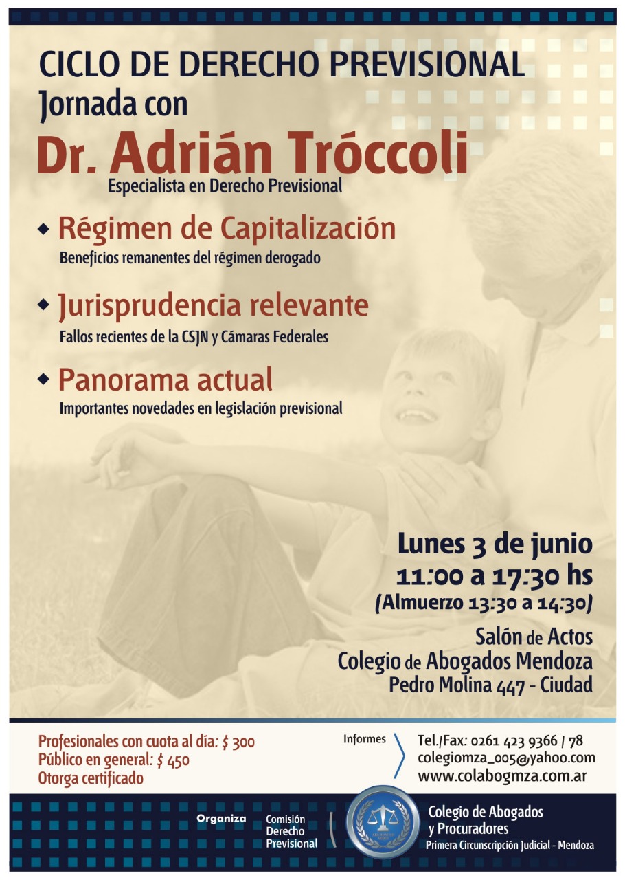 Adrián Tróccoli disertará en la segunda jornada de especialización que busca profundizar temáticas vinculadas al Derecho Previsional. Será el lunes 3 de junio entre las 11 y las 17.30 en el Auditorio del Colegio.