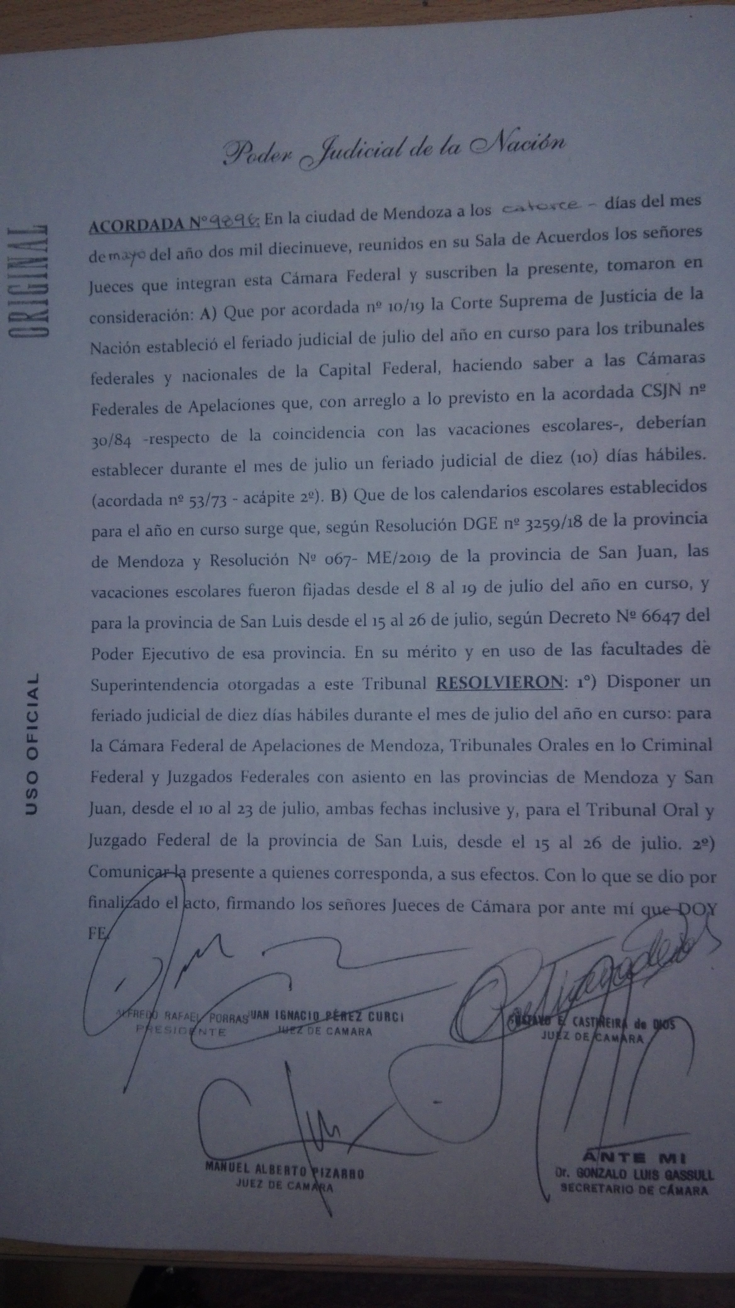 El Directorio pone a disposición de los matriculados la acordada N° 9896 del P.J.N. en la que se resuelve «disponer un feriado judicial de diez días hábiles durante el mes de julio del año en curso:… desde el 10 al 23 de Julio…»