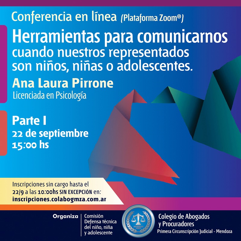 Una conferencia on line a través del Zoom del Colegio de Abogados y Procuradores de la Primera Circunscripción Judicial de Mendoza se ocupará de ofrecer herramientas de comunicación en el caso de representar a niñas, niños y adolescentes. La primera parte de la capacitación, que será gratuita, está prevista para el miércoles 22 de septiembre a las 15. Los interesados pueden inscribirse hasta el mismo día a las 10 a través del formulario que se consigna a continuación: inscripciones.colabogmza.com.ar