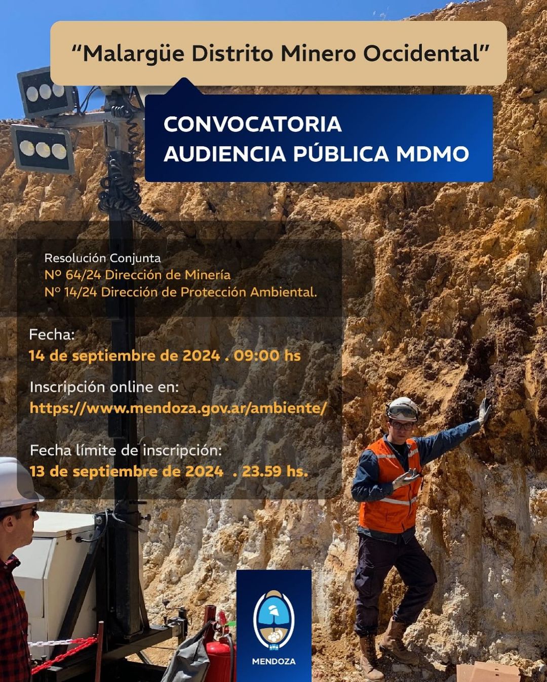 La Audiencia Pública «Evaluación de informes de impacto ambiental de los proyectos de exploración minera: el seguro y otros. Proyecto Malargüe Distrito Minero Occidental» se llevará a cabo el sábado 14 de septiembre, desde las 9. Fue convocada mediante Resolución Conjunta Nº 64/ 24 de la Dirección de Minería y Nº 14/24 de la Dirección de Protección Ambiental.