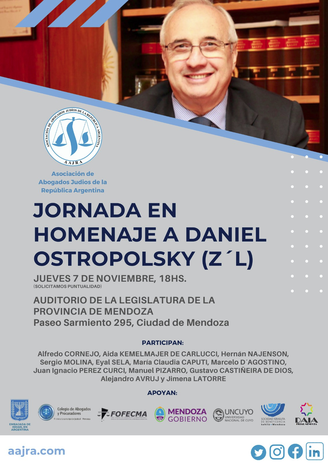 La Asociación de Abogados Judíos de la República Argentina (AAJRA) organiza una jornada de homenaje a Daniel Ostropolsky, destacada figura en el ámbito jurídico y académico. El evento se realizará el jueves 7 de noviembre a las 18 en el auditorio de la Legislatura de la Provincia de Mendoza, ubicado en Paseo Sarmiento 295, Ciudad de Mendoza.