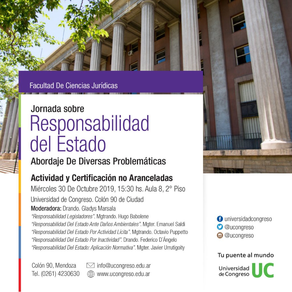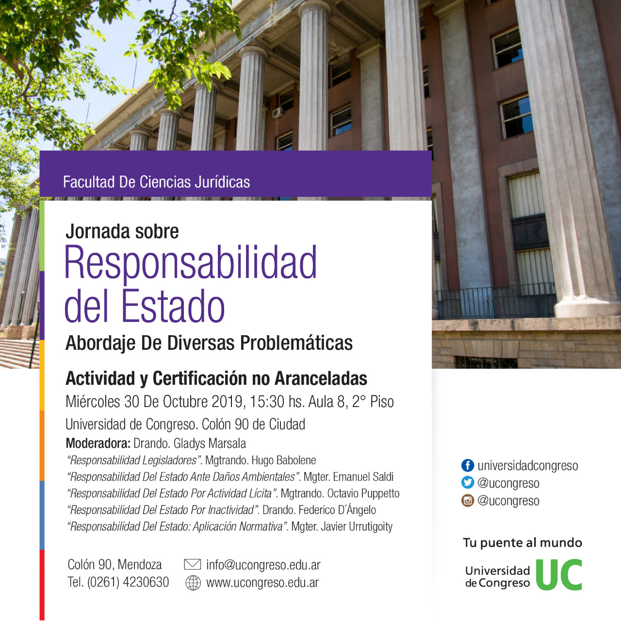 La Jornada sobre Responsabilidad del Estado es una actividad y certificación no aranceladas. La organiza la Facultad de Ciencias Jurídicas y tendrá lugar el miércoles 30 de octubre a las 15.30 en aula 8, 2º piso de la Universidad de Congreso.
