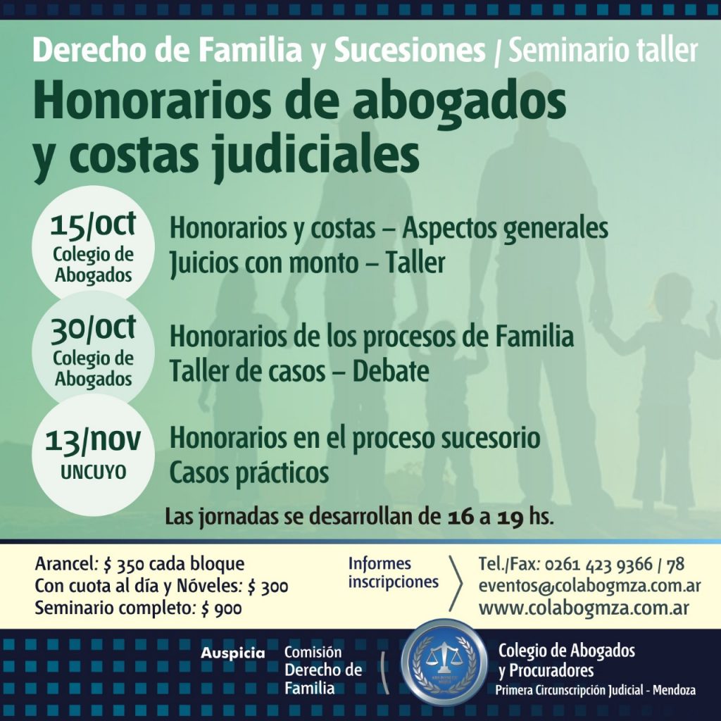 Los aspectos generales de honorarios y costas en el Derecho de Familia son el tema central de un seminario que se dictará en tres jornadas de 16 a 19. Dos de los encuentros se desarrollarán el martes 15 y el miércoles 30 de octubre en el salón de actos del Colegio de Abogados y Procuradores de Mendoza, en Pedro Molina 447 de la Ciudad de Mendoza; en tanto que la última jornada, prevista para el miércoles 13 de noviembre, será en la Facultad de Derecho de la UNCuyo, en el Centro Universitario de la Ciudad de Mendoza.