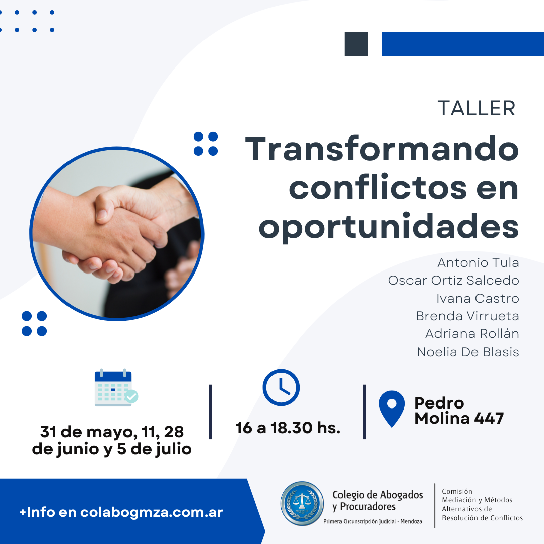 “Transformando conflictos en oportunidades” es el nombre de un taller destinado a profesionales del derecho interesados en formarse en resolución de los conflictos de manera no adversarial. Se realizará el 31 de mayo, 11, 28 de junio y 5 de julio, de 16 a 18.30, en la sede del Colegio ubicada en calle Pedro Molina 447 de Ciudad.