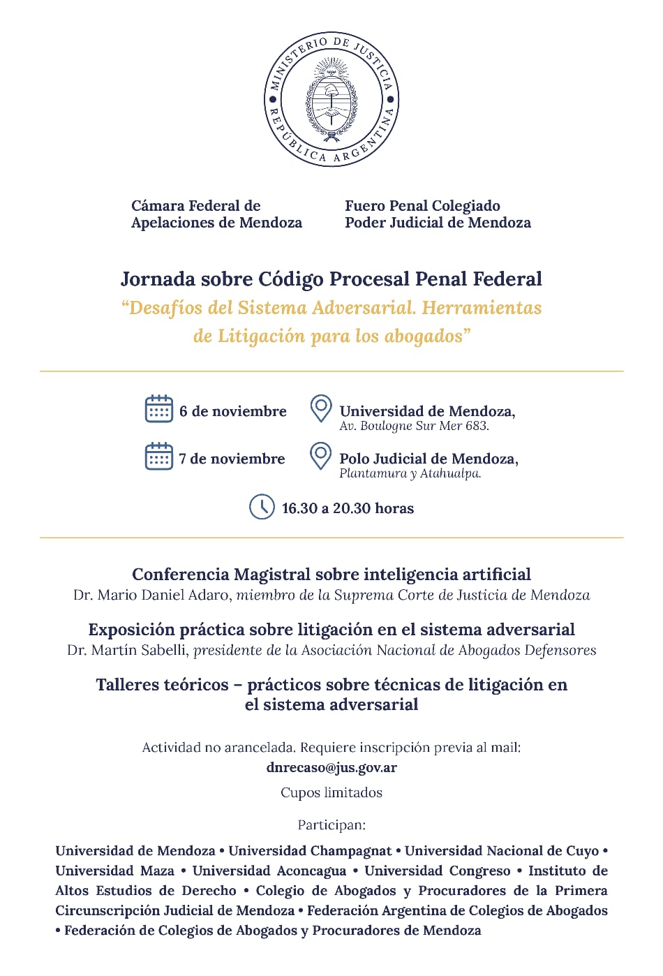 Profesionales podrán participar la Jornada sobre el Código Procesal Penal Federal «Desafíos del Sistema Adversarial. Herramientas de Litigación para los abogados». Será el 6 de noviembre, en la Universidad de Mendoza, Av. Boulogne Sur Mer 683; y el 7 de noviembre en el Polo Judicial de Mendoza, Plantamura y Atahualpa, de 16.30 a 20.30 hs. La actividad es libre y gratuita con cupos limitados. Los interesados podrán inscribirse a través del correo dnrecaso@jus.gov.ar