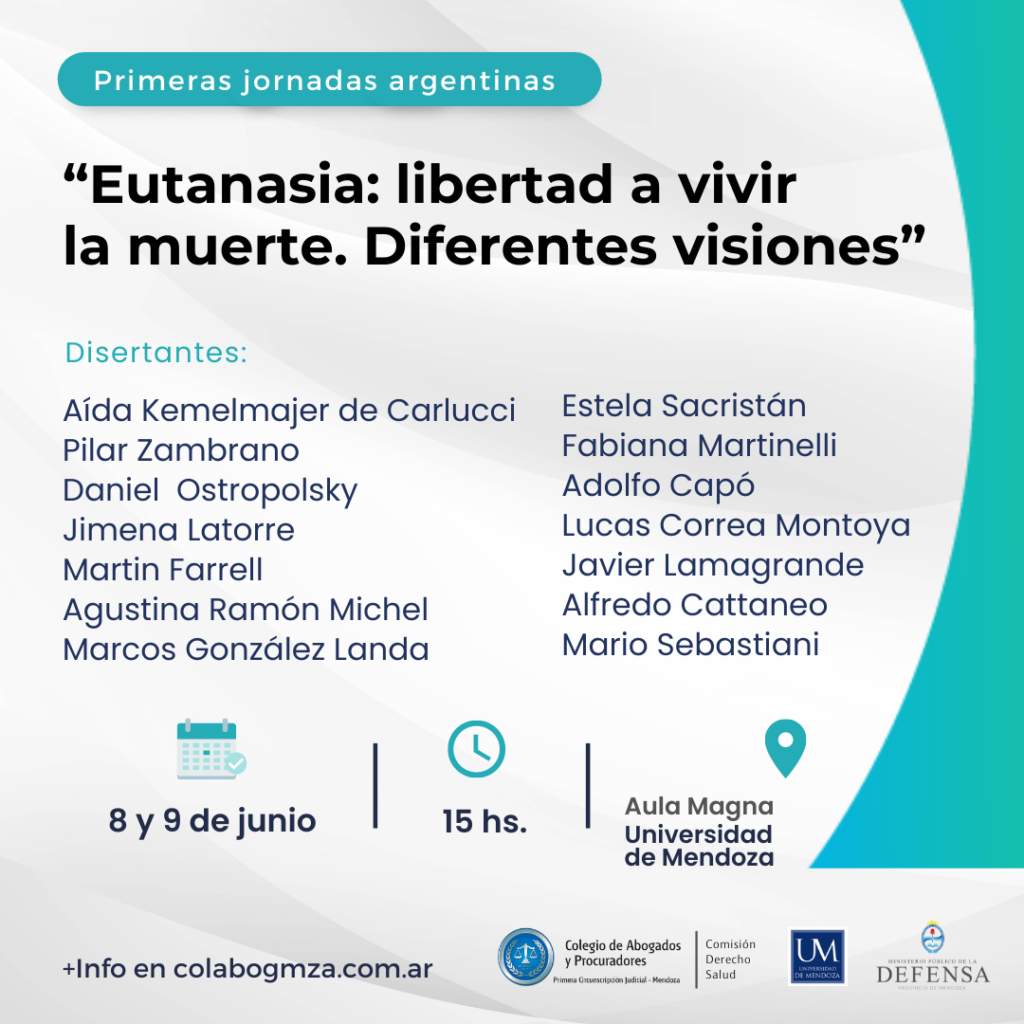 Se trata de las primeras jornadas a nivel nacional sobre el tema. Se denominan “Eutanasia: libertad a vivir la muerte. Diferentes visiones” y buscan analizar los proyectos de ley vigentes en Argentina y abordar la temática desde distintas disciplinas como el Derecho, la Medicina, la Bioética o la Tanatología con referentes a nivel provincial, nacional e internacional. Serán una serie de disertaciones y debates que se organizaron en dos días; miércoles 8 y jueves 9 de junio entre las 15 y las 19.30 en el Aula Magna de la Universidad de Mendoza, ubicada en el paseo Dr. Emilio Descotte 750.