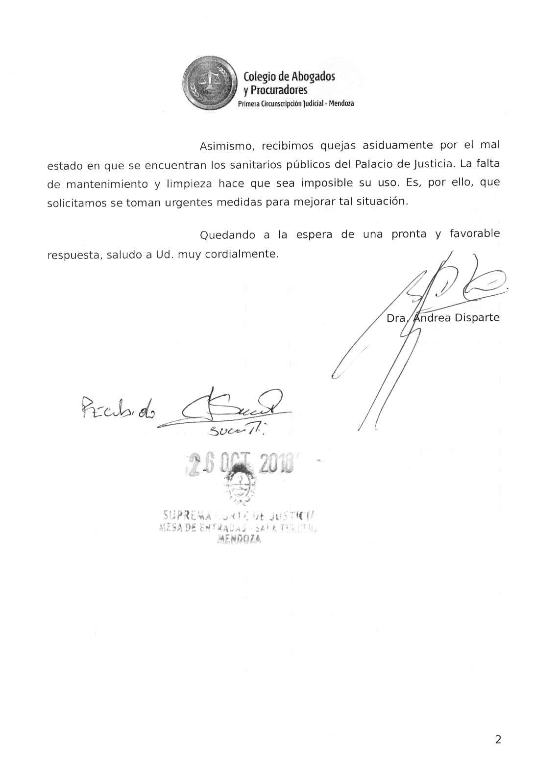 La presidenta, Andrea Disparte, presentó un reclamo en representación del Directorio del Colegio de Abogados y Procuradores de la Primera Circunscripción. El escrito, fechado el 22 de octubre pasado está dirigido al Presidente de la Suprema Corte de Justicia de Mendoza, Jorge Nanclares, y recuerda que, en reiteradas ocasiones, el Colegio debió señalar las situaciones de incomodidad que los profesionales del foro, letrados, funcionarios y hasta público en general, viven a diario con el deficiente funcionamiento de ascensores y el estado de los sanitarios en el Palacio de Justicia y las Cámaras Laborales que se ubican en San Martín 322.