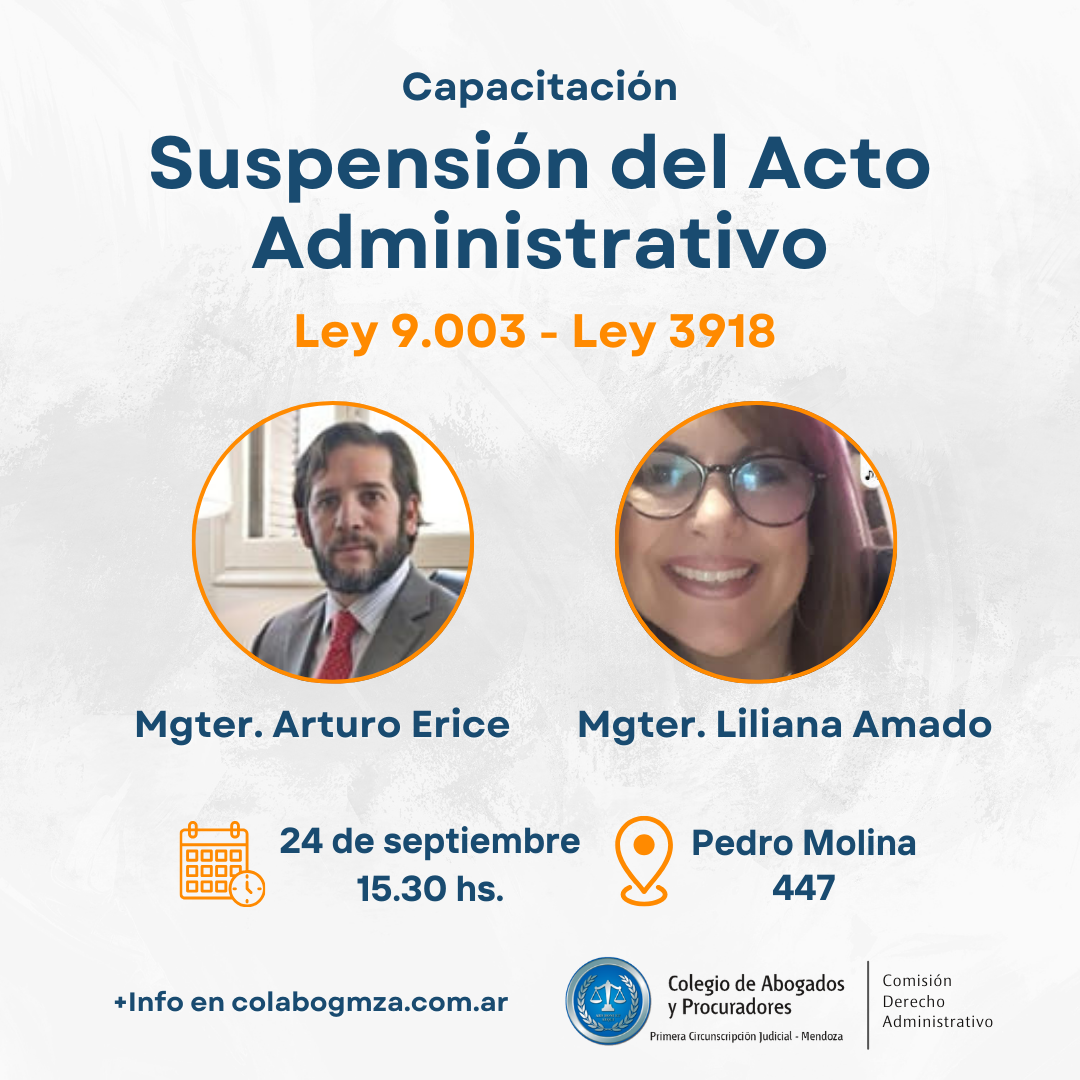 Profesionales del Derecho podrán participar de una jornada sobre «Suspensión del Acto Administrativo. Ley 9.003 – Ley 3918”. Se realizará el 24 de septiembre, a las 15.30, en la sede del Colegio de Abogados de Mendoza ubicada en Pedro Molina 447 de Ciudad.