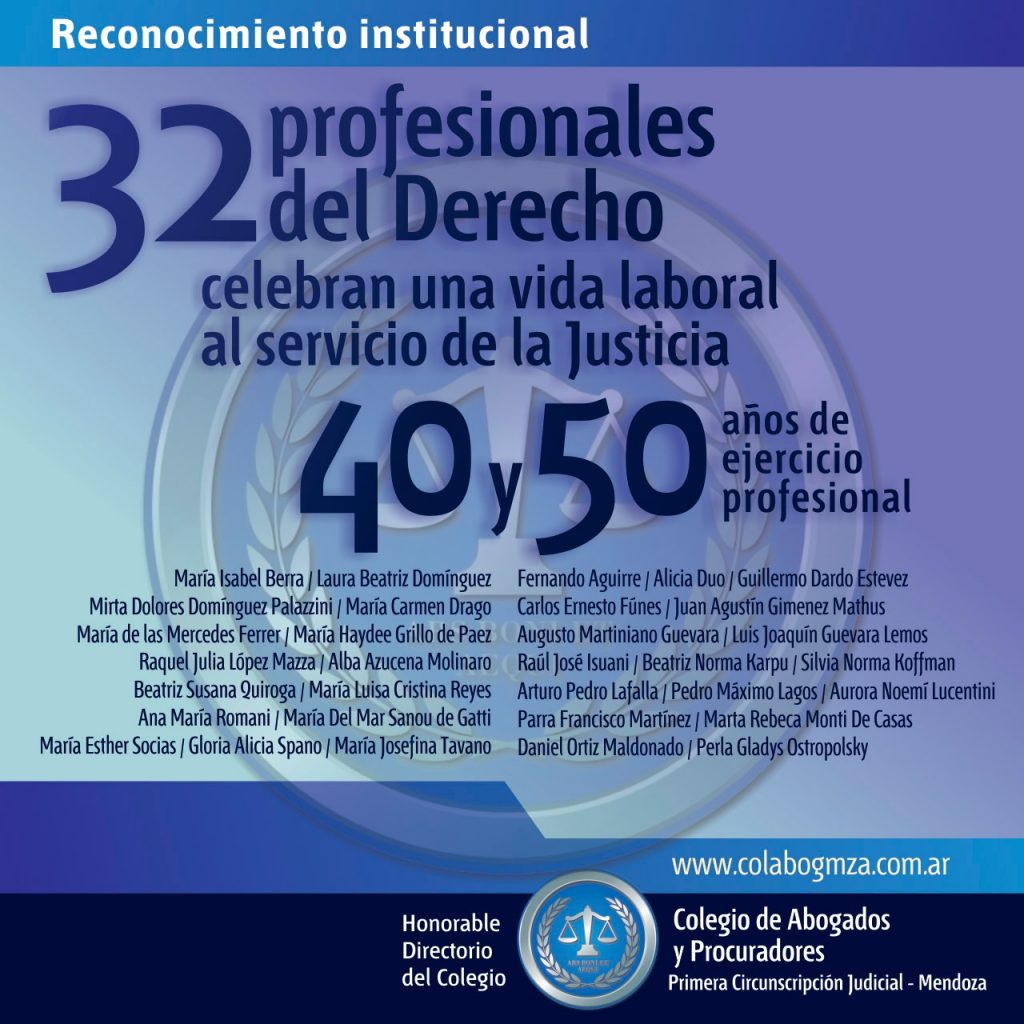 Fue en el Colegio de Abogados y Procuradores de la Primera Circunscripción Judicial de Mendoza. Presidente, vicepresidente y miembros del Directorio participaron del acto de entrega de medallas que reconoce el servicio a la justicia de abogados del medio.