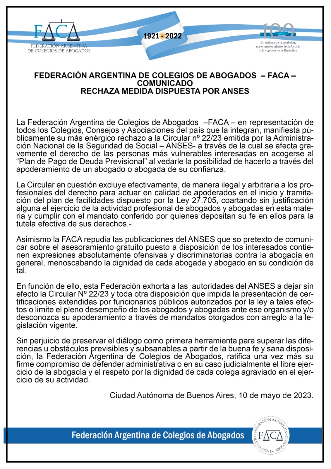 Autoridades del Colegio de Abogados y Procuradores de la Primera Circunscripción Judicial de Mendoza solicitaron por nota a la jefatura Regional Cuyo de la ANSES, que ordene a las Unidades de Atención Integral (UDAI) y oficinas de la Región que acepten la suscripción de todos los formularios y documentación relativos al Plan de Pago de la Ley 27.705 por parte de los apoderados (previa o concomitantemente al inicio del expediente).