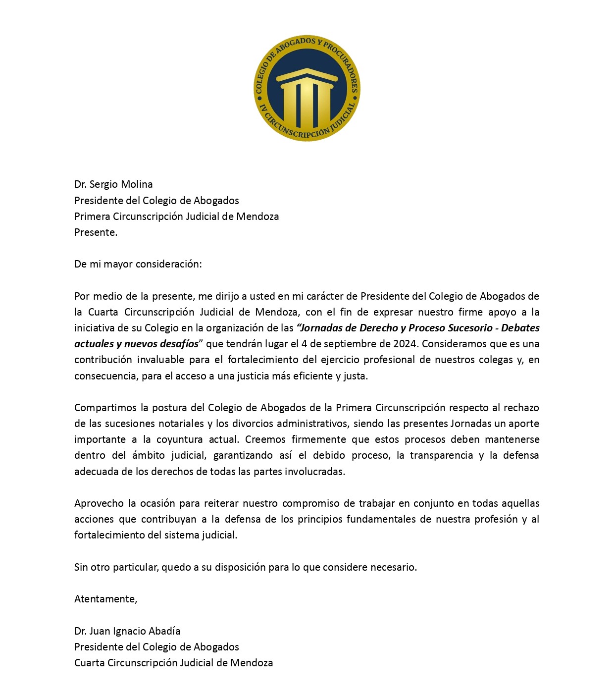 Colegio de Abogados de la Cuarta Circunscripción Judicial de Mendoza expresaron su apoyo a la iniciativa del Colegio en la organización de las “Jornadas de Derecho y Proceso Sucesorio – Debates actuales y nuevos desafíos”. A continuación está disponible la nota completa.
